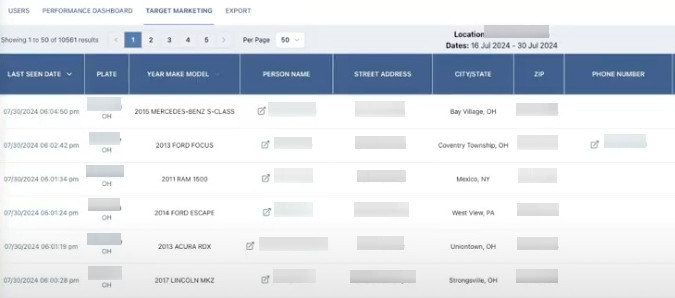 The Target Marketing page displays marketing data attributes that are relevant to your organization. There are 270 data attributes provided with each marketing export file, and these attributes are grouped into categories such as Person Name, Year Make Model, scan dates, and address and contact information for ease of use.