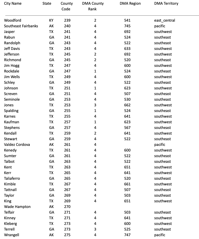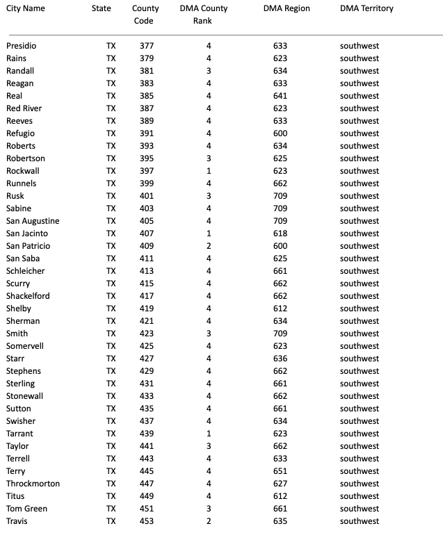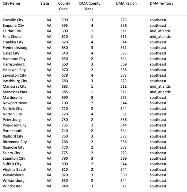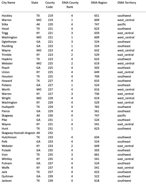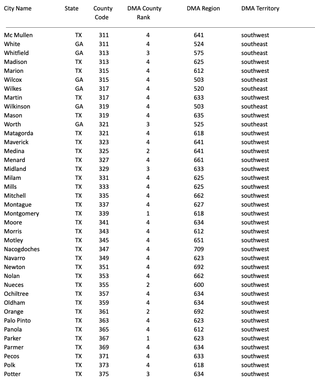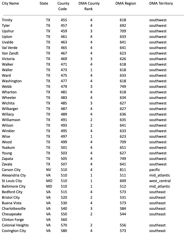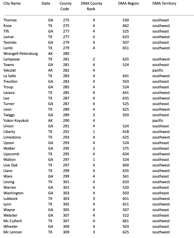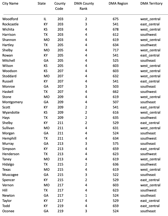 DMA Region, DMA Territory, County Code (203-840)